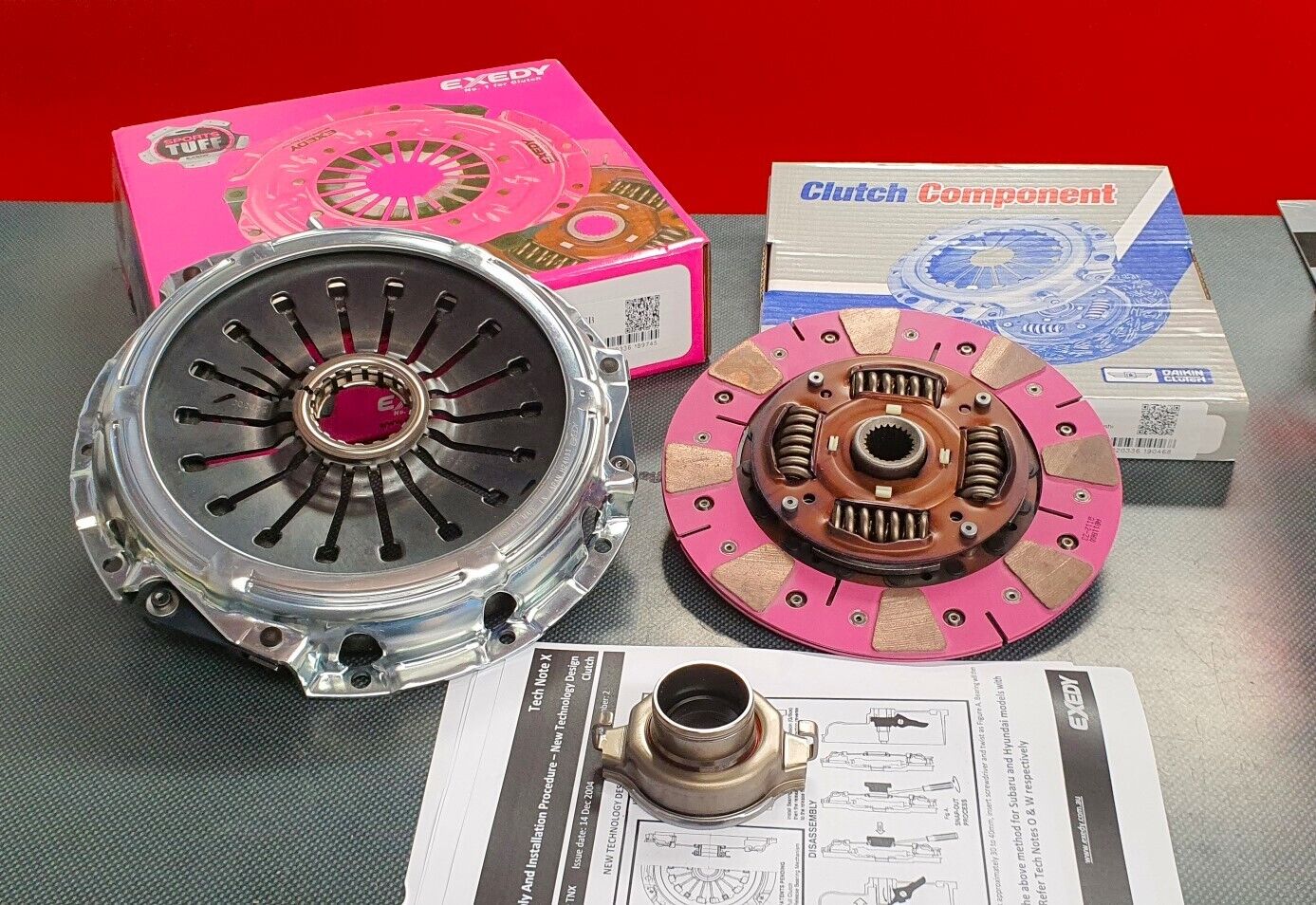 The EXEDY clutch range for standard passenger cars features premium-quality cover assemblies, clutch discs, and release bearings, all packaged in the distinctive silver and blue kit box.